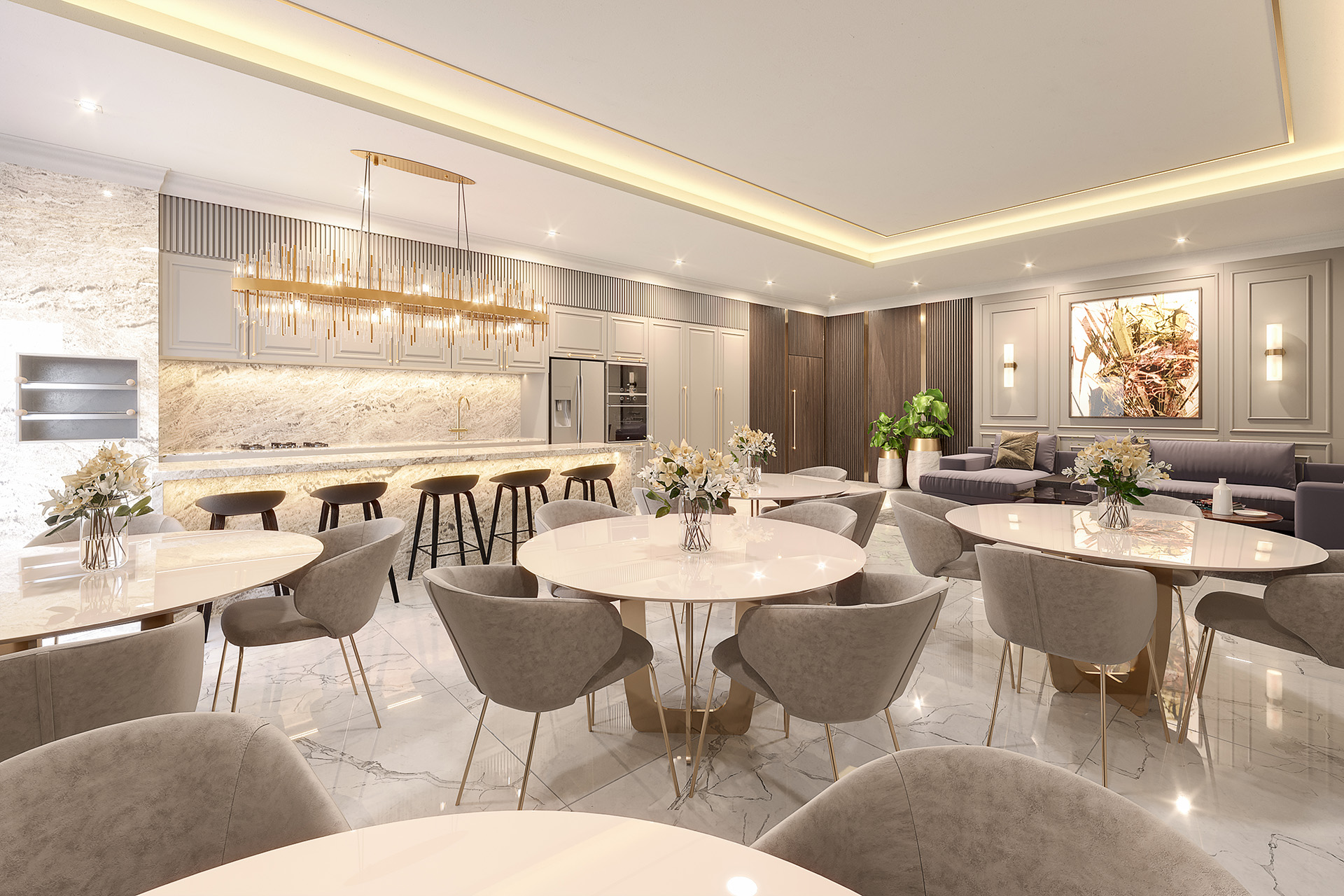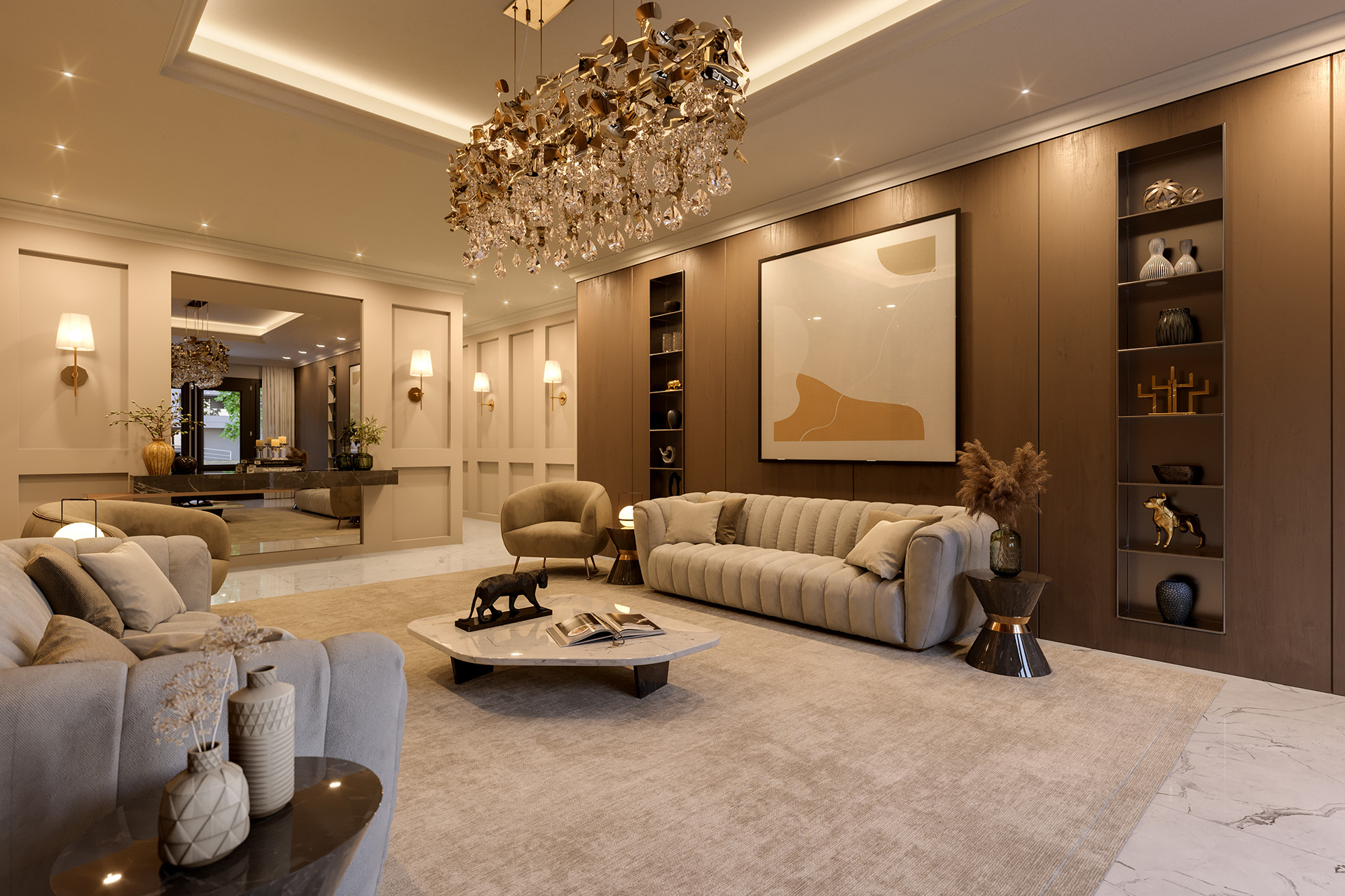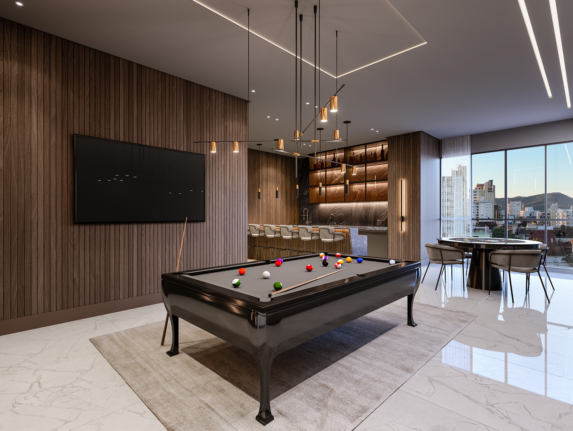 - Acabamento neoclássico em mármores, granitos, detalhes em gesso, madeira, porcelanato e papel de parede;