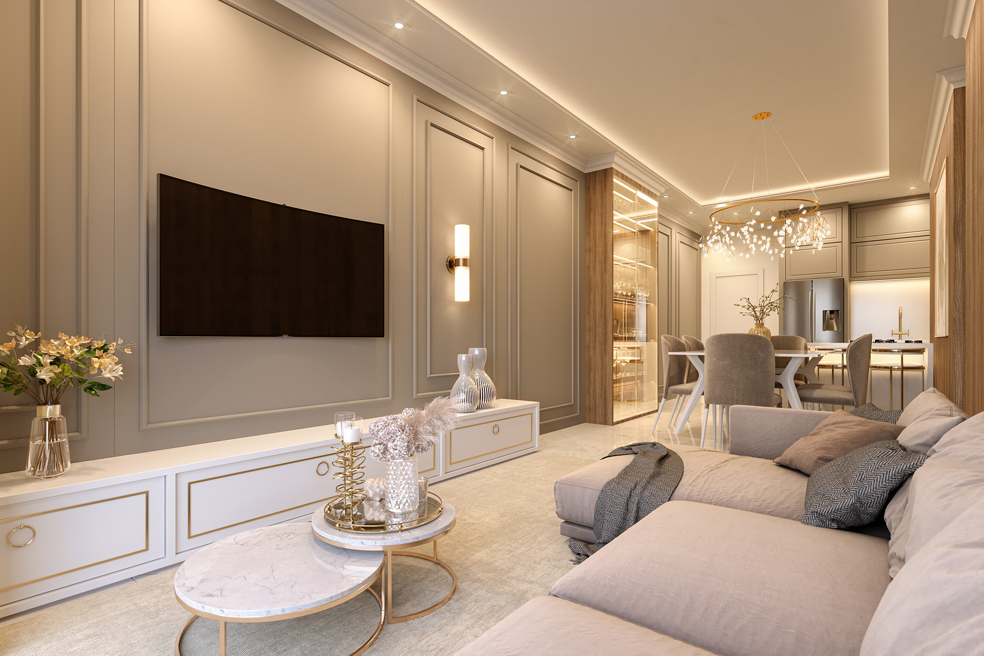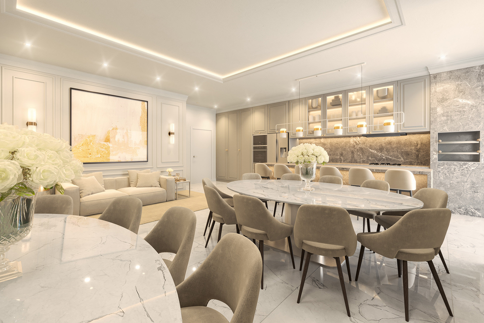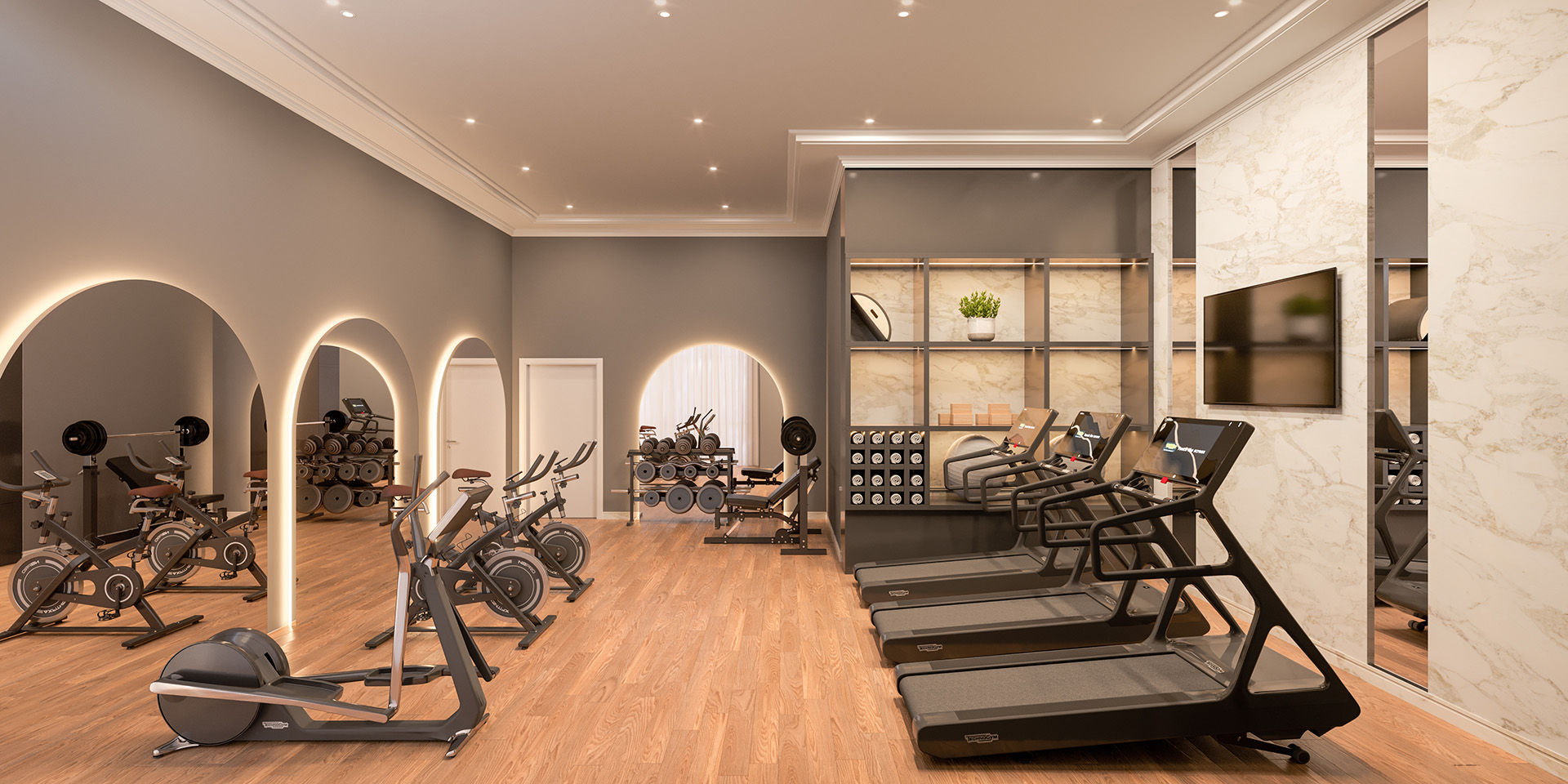 - Acabamento neoclássico em mármores, granitos, detalhes em gesso, madeira, porcelanato e papel de parede;